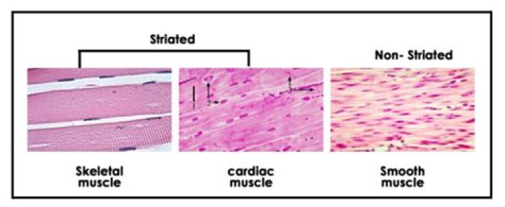 The cardiac muscle is the muscle of the heart. Both cardiac muscle and the skeletal muscle have rather conspicuous striations when viewed under the microscope (in which the smooth muscle is lacking, thus the name).
