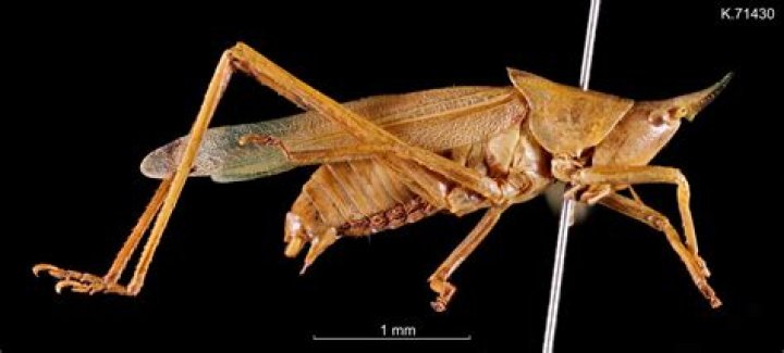 What looks like a grasshopper but is brown?