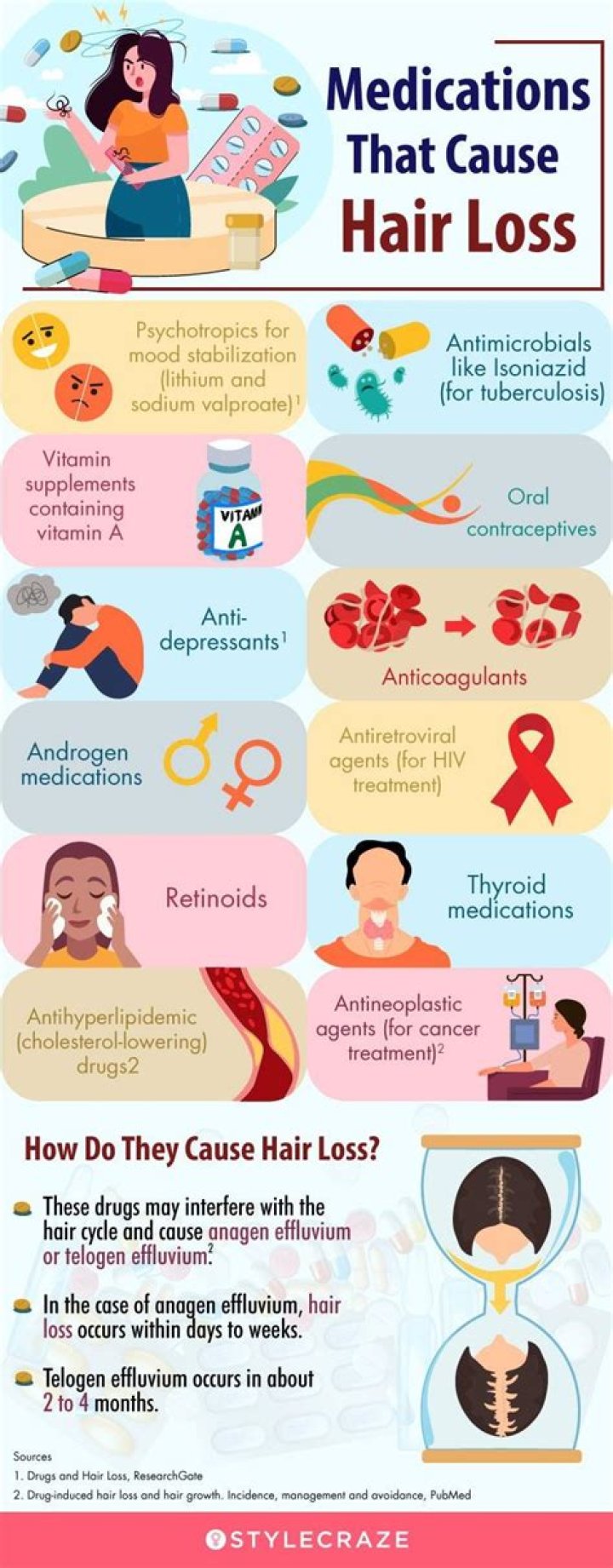 Drug-induced hair loss is usually reversible after interruption of treatment. The prevalence and severity of alopecia depend on the drug as well as on individual predisposition.