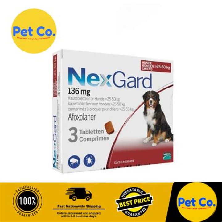 NexGard is given as a tablet of the appropriate strength for the dog’s bodyweight. NexGard kills fleas within 8 hours and ticks within 48 hours. After being given, its actions last for at least 5 weeks against fleas and up to one month against ticks.