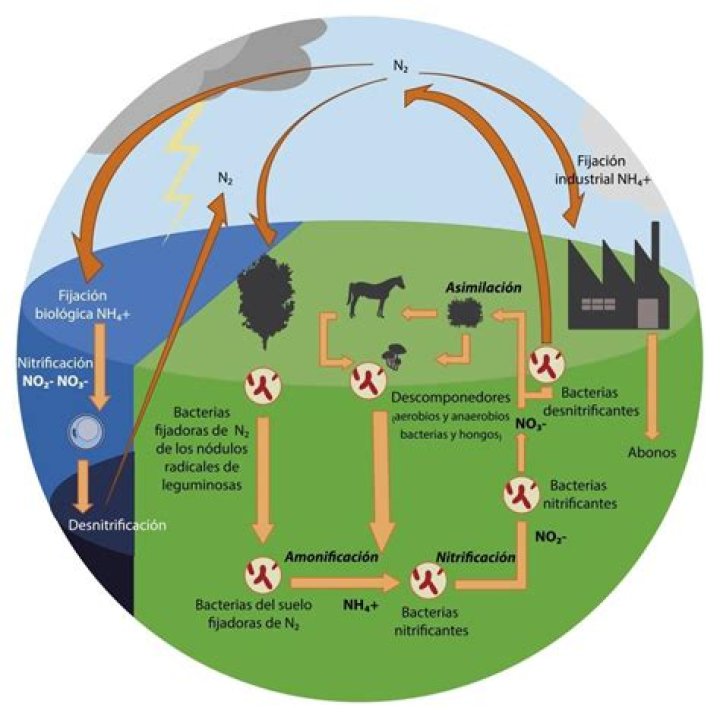 Las bacterias nitrificantes transforman el amonio en nitrito, NO2-, y luego en nitrato, NO3-. Las bacterias desnitrificantes convierten el nitrato de nuevo a nitrógeno gaseoso, que regresa a la atmósfera.¿Cómo ocurre el ciclo del nitrógeno?