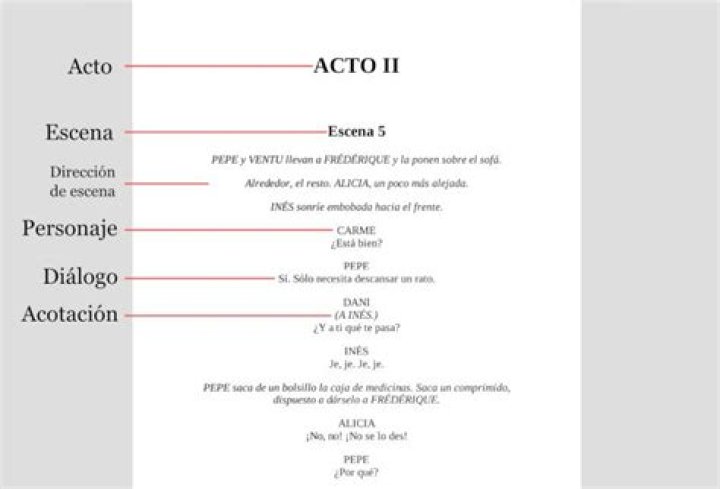 El acto, también llamado jornada, es cada parte importante de la obra dramática; se anuncia con la subida (inicio) y bajada (final) del telón. … La escena es el segmento del acto en que actúan los mismos personajes; se determina con la entrada o salida de ellos. … Se caracteriza por la entrada o salida de personajes.