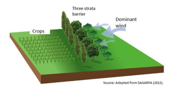 Windbreaks are such structures which break the wind-flow and reduce wind speed while shelterbelts are rows of trees or shrubs planted for protection of crop against wind. They provide a protective shelter against wind and suitable habitat for birds and honeybees as well as produce cattle feed and fuel wood.