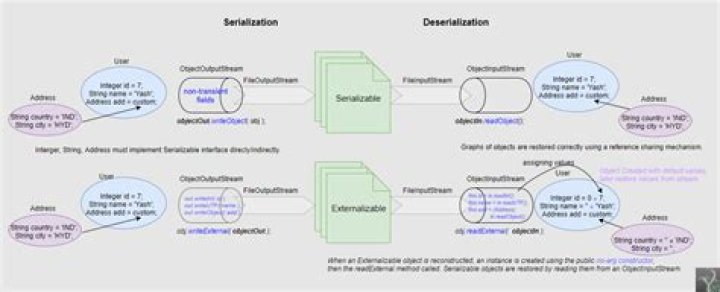 Serialization and externalization both are the processes of converting an object to stream byte and storing byte stream in database or memory. The class which implements java. … On the other hand, externalization used for custom serialization based on the requirement in the application. Externalization extends java.