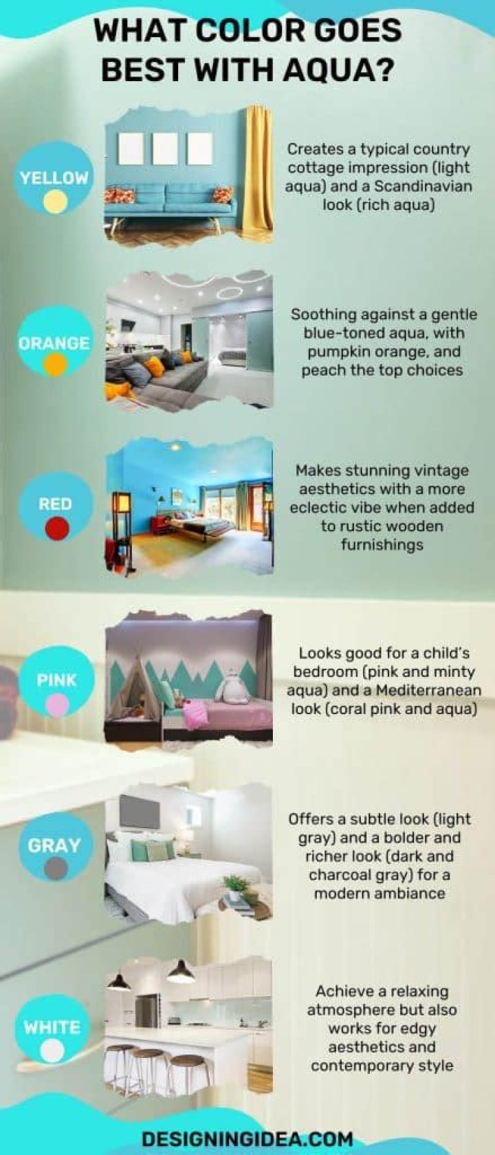 Colors that go with aqua are pale gold, wheat, white and cream. Shades of red and orange have the most impact.