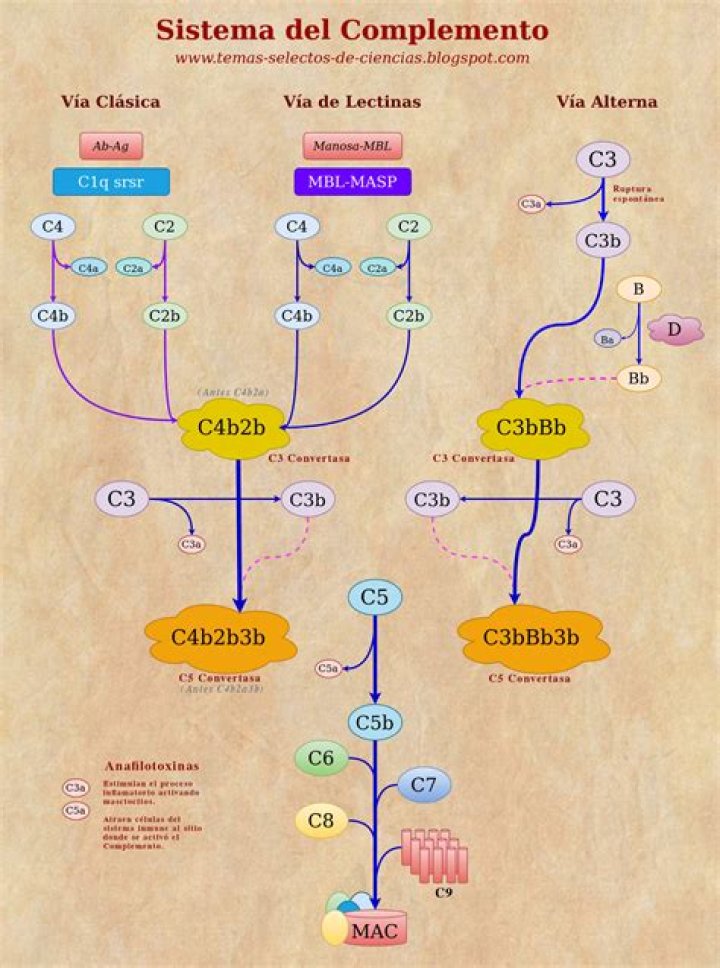 El complemento puede ser activado a través de tres rutas distintas (Figura 1), causando la activación de C3, su fragmentación en un fragmento grande, C3b que actúa como opsonina, y otro pequeño, C3a (una anafilotoxina) que promueve inflamación.