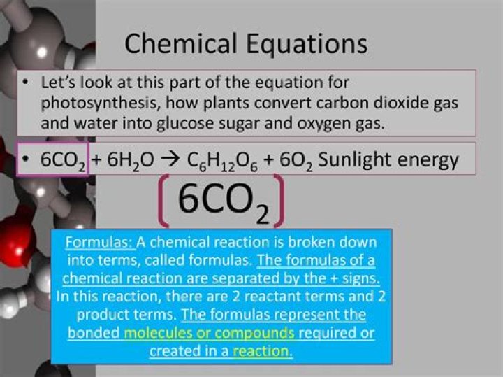 Chemical Equation. A combination of symbols and chemical formulas used to describe what happens in a chemical reaction. The equation identifies the reactants and resulting products. Coefficient. A number written in front of a chemical formula to show how many molecules of that substance are present.
