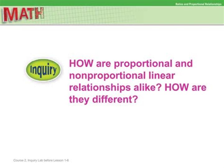 Non-proportional linear relationships have a constant rate of change (slope). Non-proportional linear relationships do NOT have common ratios from each output to each input.