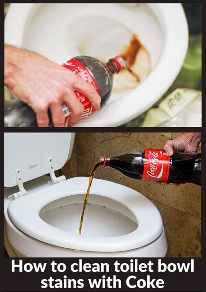 Pour Coca-Cola along the edges of the toilet bowl — the carbonation will take care of the heavy lifting for you!Leave the soda in the toilet overnight.The next morning, flush the fizz away and your toilet will look good as new.