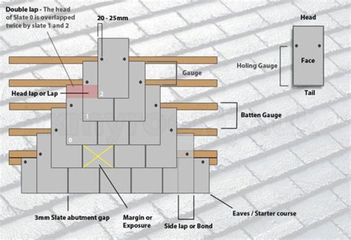 On a slate roof this is the critical overlap and is necessary to prevent water penetration and leakage. The roof pitch typically relates to the required head lap as follows: 20 degrees: 115 mm minimum head lap. 25 degrees: 85 mm.
