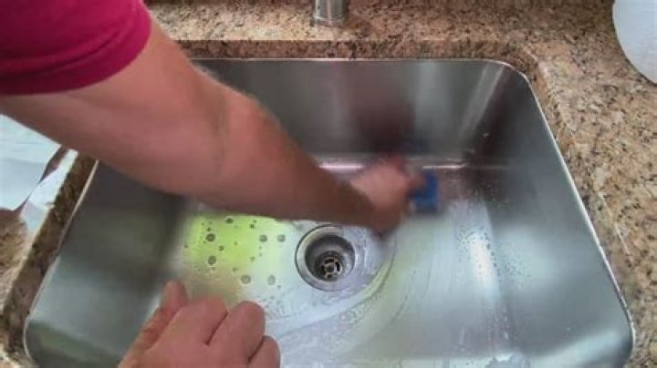 First, wet down the sink and sprinkle baking soda onto a moist sponge. Then scrub the sink with baking soda. Next, pour home hydrogen peroxide on the sponge and rub all over the sink. Wait about 15-20 minutes, and then rinse the whole sink.