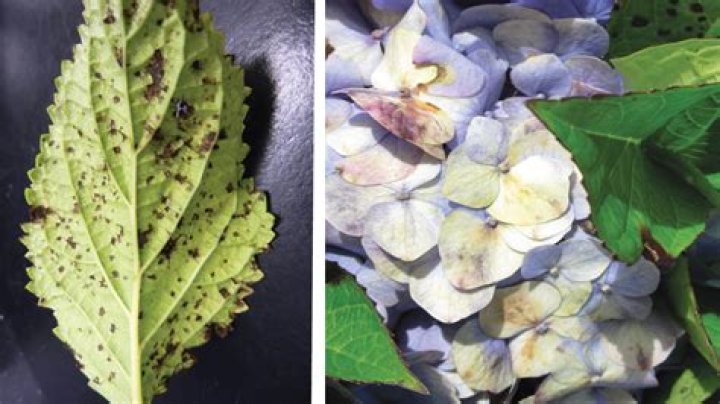 This fungal disease looks like round, orangish spots on the underside of hydrangea leaves. The tops of leaves turn brown or yellow and eventually fall off. Rust spores are spread in water or on the wind, so avoid splashing your plants when watering. Using soaker hoses rather than sprinklers or spray nozzles can help.