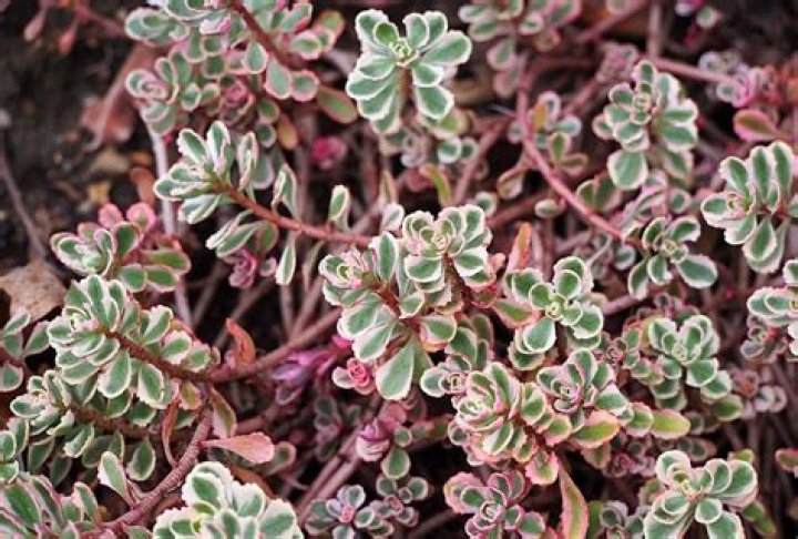 Sedum spurium ‘Tricolor’ has very small green and white leaves with pink margins. A very low-growing succulent perennial, it gradually spreads to form loose mats. The foliage of Sedum ‘Tricolor’ turns red in cold weather. It produces small pink flowers in summer.