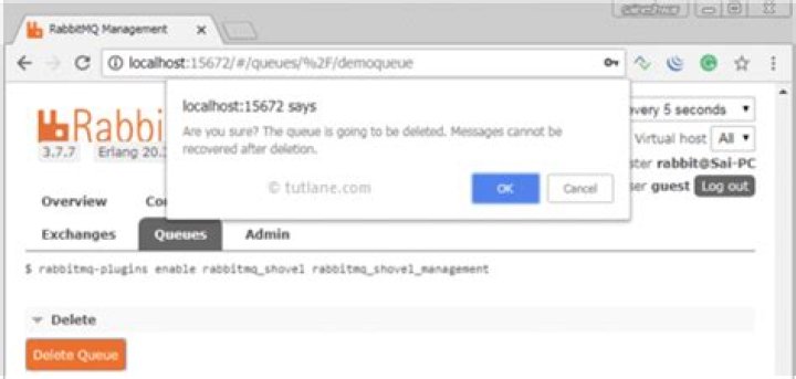 RabbitMQ Management Interface Enter the queue tab and go to the bottom of the page. You will find a dropdown “Delete / Purge”. Press Delete to the left to delete the queue.