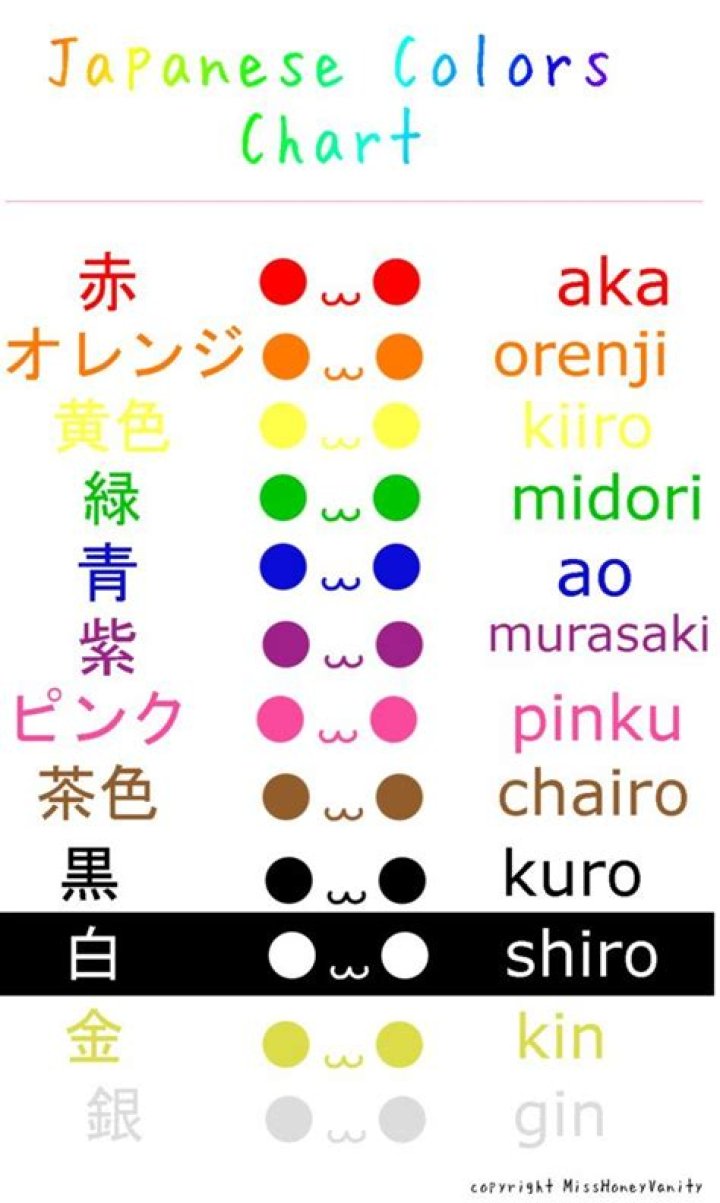 KanjiFuriganaRomaji色いろiro無色むしょくmushoku