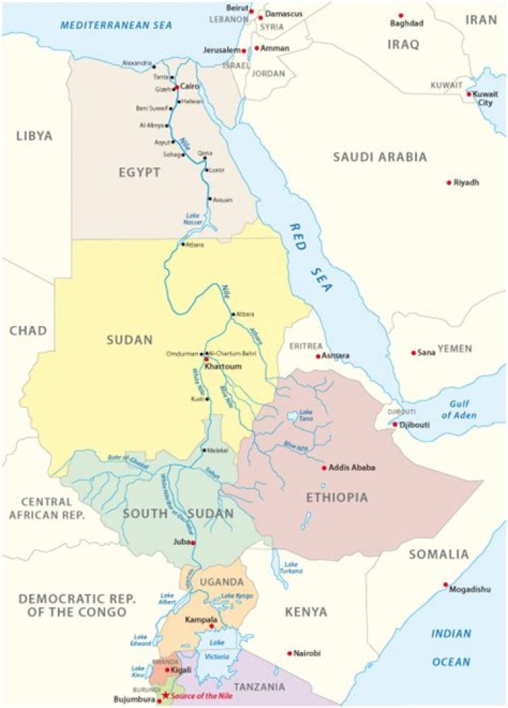 The Nile River was critical to the development of ancient Egypt. In addition to Egypt, the Nile runs through or along the border of 10 other African countries, namely, Burundi, Tanzania, Rwanda, the Democratic Republic of the Congo, Kenya, Uganda, Sudan, Ethiopia, and South Sudan.
