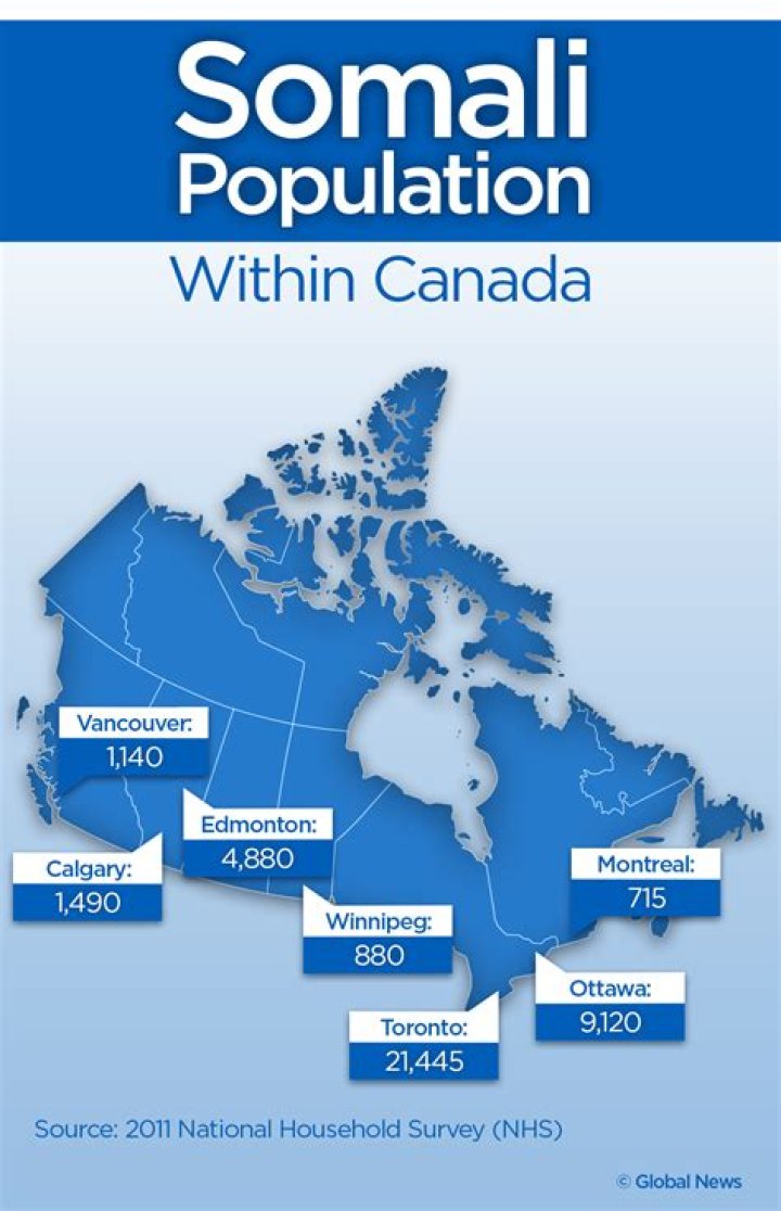 According to Statistics Canada, there are 44,995 persons of Somali origins in Canada. Of these, 4,315 are recent immigrants and 37,115 live in Somali-speaking households.