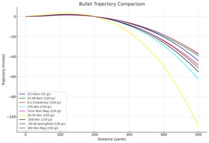 308 . I sight it in at 2 inches high at 100 yards. At 200 yards the bullet will hit about 2 inches low.