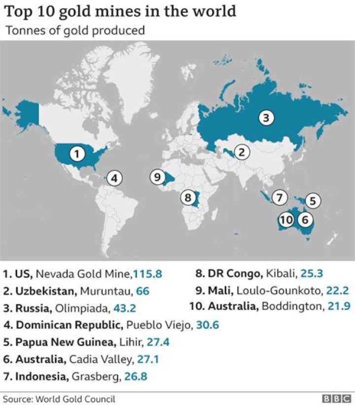 About 244,000 metric tons of gold has been discovered to date (187,000 metric tons historically produced plus current underground reserves of 57,000 metric tons). Most of that gold has come from just three countries: China, Australia, and South Africa. The United States ranked fourth in gold production in 2016.