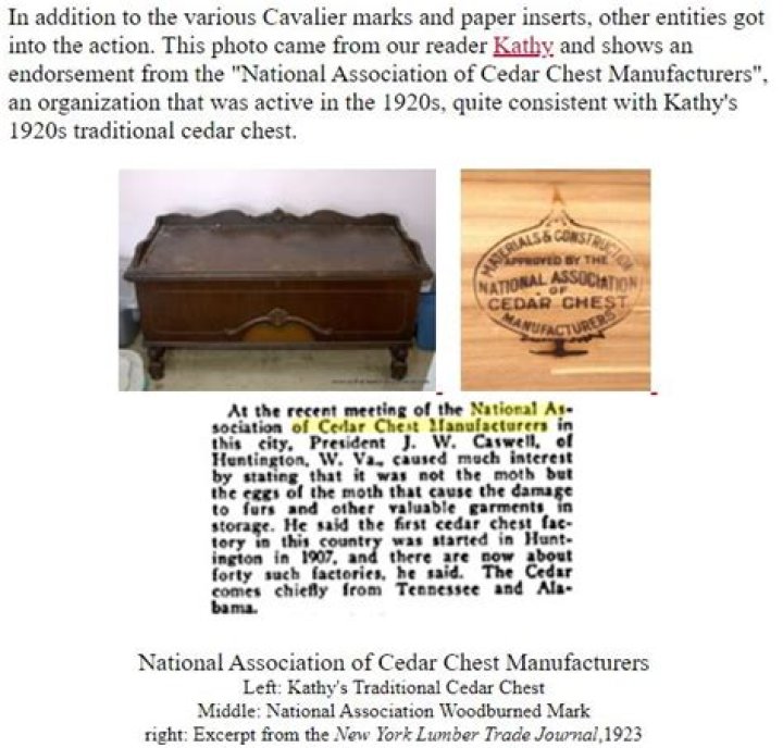 A. Your chest is a 1920s-early 1940s piece made by the Cavalier furniture company, founded in 1865 in Chattanooga, Tenn. The company was known for bedroom sets and cedar chests. Rec room collectors know that later, the firm diversified by making Coca-Cola vending machines.