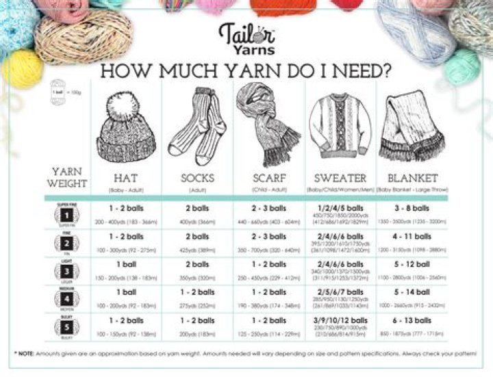 Lace500–1000 yards per 100 gramsDK190–300 yards per 100 gramsWorsted190–240 yards per 100 gramsAran140–190 yards per 100 gramsBulky100–140 yards per 100 grams