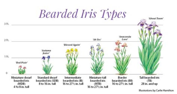 The flower stalks range in height from 8 to 40 inches, depending on the variety, and are hardy in zones 3 to 9. Cultivars are often divided into groups by height, ranging from dwarf bearded to tall bearded. Blooms come in a range of colors, and the plants have stiff, upright leaves.