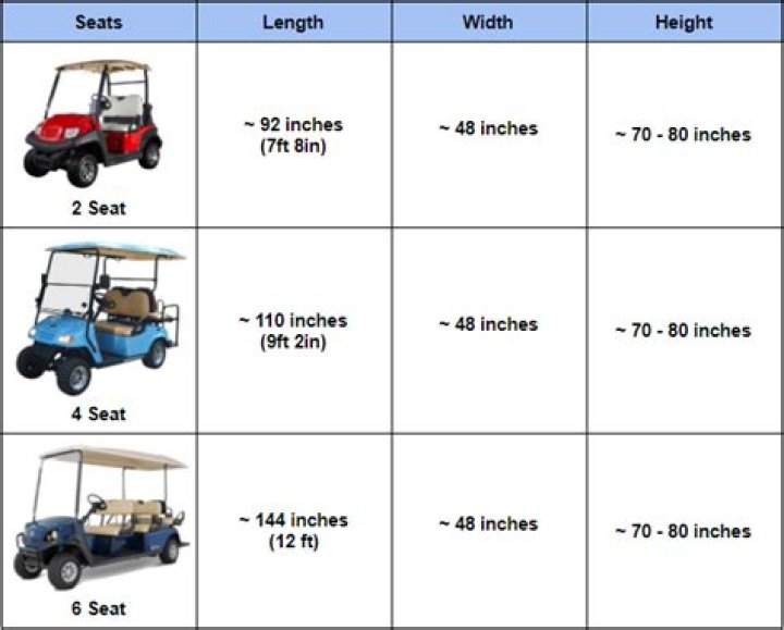 In general, the average 4 seater golf cart is about 5.5 feet tall, 8 feet long, and 4 feet wide. For LSVs with six seats, the aforementioned length extends to roughly 11.5 feet, whereas the other approximations remain the same.