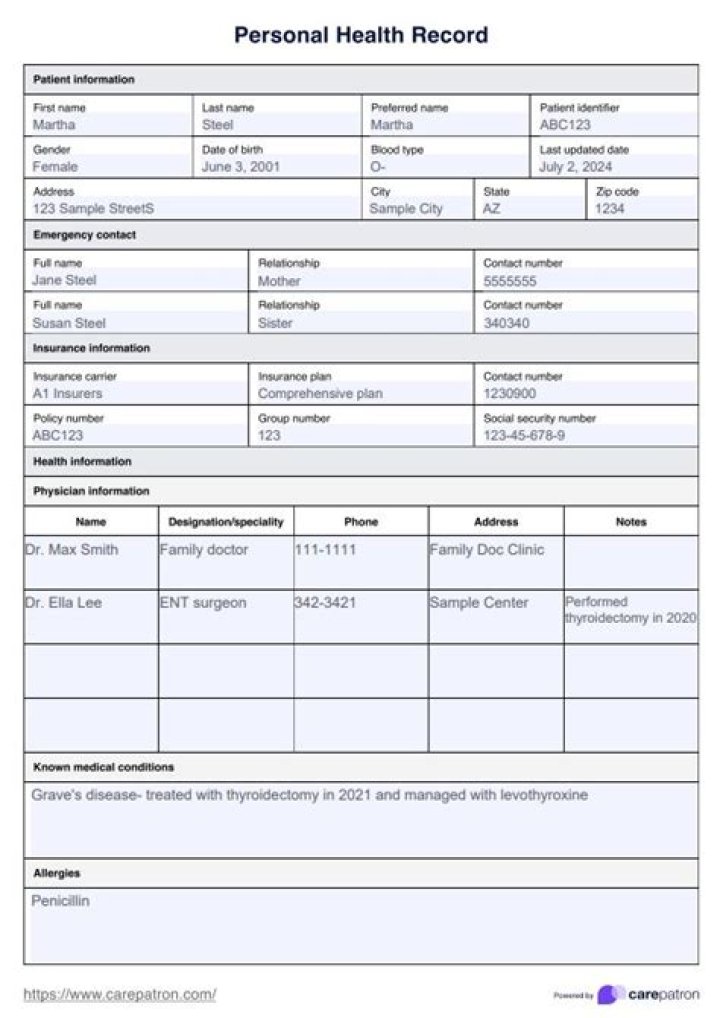 What is the purpose of the patient's personal health record for physician?
