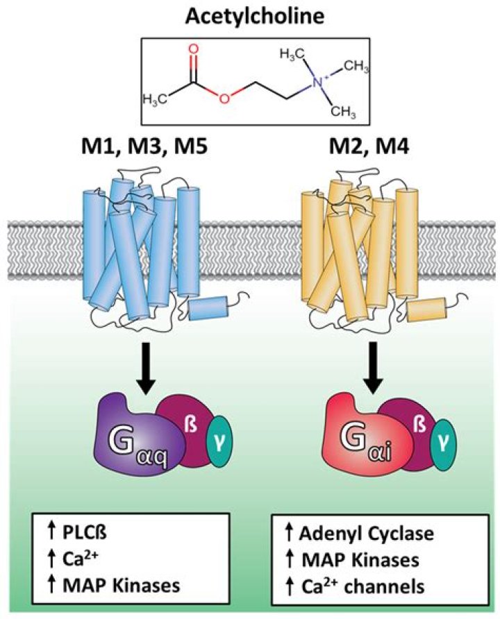 Acetylcholine receptors (AChRs), like many other ligand-activated neurotransmitter receptors, consist of two major subtypes: the metabotropic muscarinic receptors and the ionotropic nicotinic receptors.