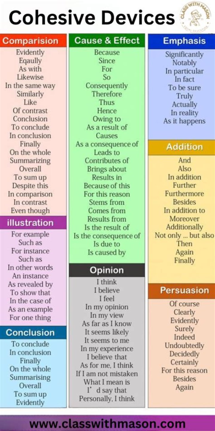 Cohesive devices are also known as linking words and they are there to help the examiner to read through your essay clearly. Linking words are a great way to join your ideas together and make your sentences and your paragraph much more coherent.