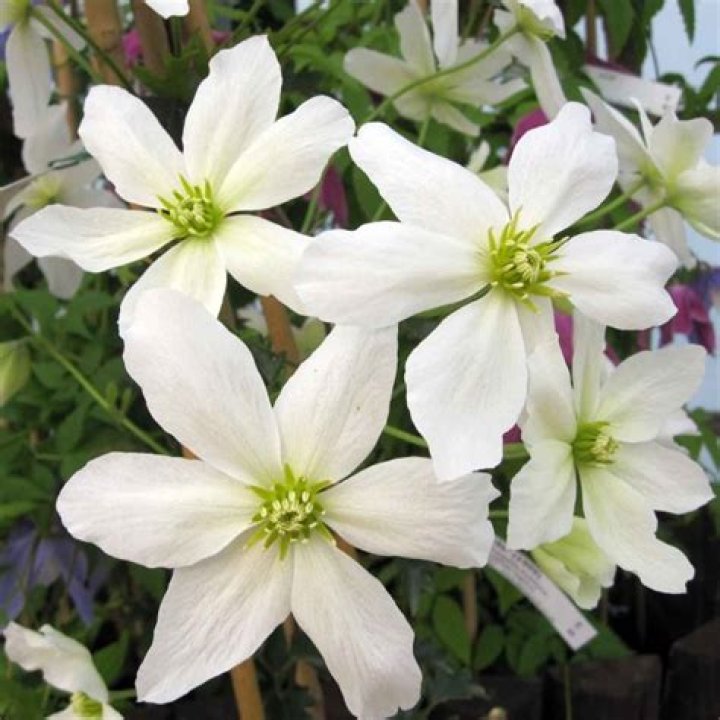 Clematis ‘Avalanche’ produces clusters of glorious pure white ‘male’ flowers with yellow stamens. They are the largest blooms in this evergreen group of clematis.
