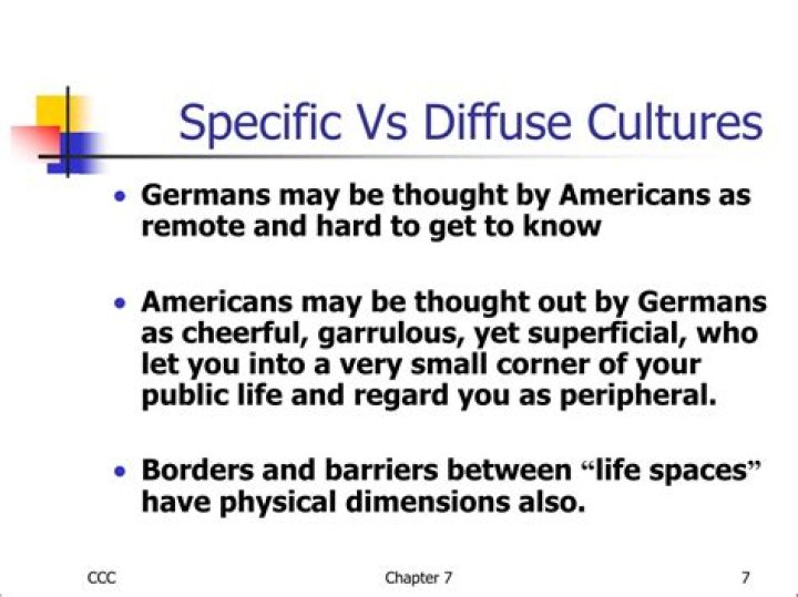 Specific cultures have a small area of privacy which is clearly separated from public life (USA). … Diffuse cultures (France, China) are concerned with keeping people’s face. Therefore why in diffuse cultures so much more time is take to get to the point.