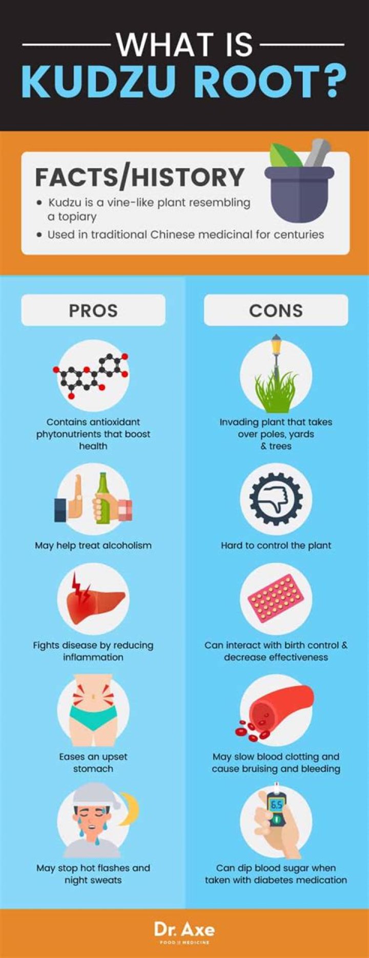 Kudzu Root Kudzu’s root, flower, and leaf are used to make medicine. It has been used in Chinese medicine since at least 200 BC. As early as 600 AD, it was used to treat alcoholism. Today, kudzu is used to reduce symptoms of alcohol hangover, including headache, upset stomach, dizziness, and vomiting.
