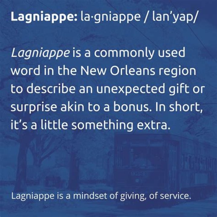 “Lagniappe” Pronounced as a French word, lagniappe (lan-yap) is a Cajun-French inspired noun that means “a little extra.” Often used to describe something good, this word is the NOLA-call for receiving anything extra, or better yet, receiving something for free.