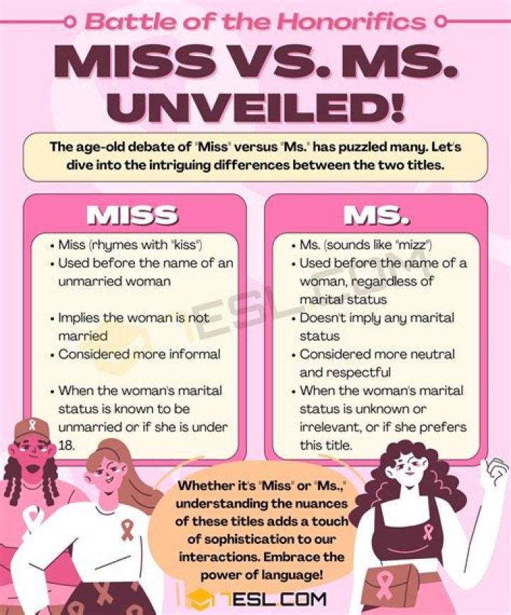 Miss is a title used generally by unmarried women. Ms. is a title used by women regardless of their marital status. Miss is used to address young or unmarried women. In some countries, it is also used to address teachers.