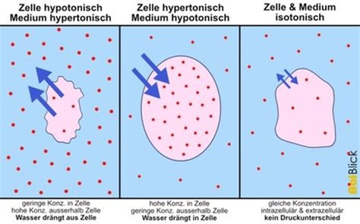 Eine Lösung mit diesem osmotischen Druck nennt man isotonisch. … Ist die umgebende Lösung hypertonisch, z.B. eine 10%ige Kochsalzlösung, diffundiert Wasser aus der Zelle heraus. Das Zellvolumen nimmt ab, die Erythrozyten nehmen eine stachlige Gestalt an.