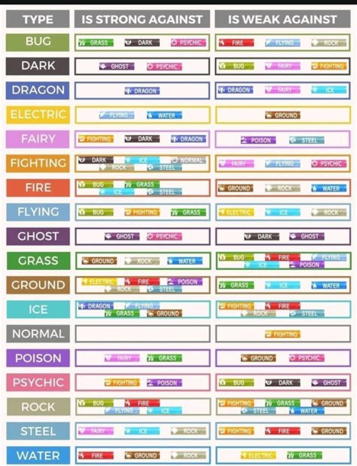 TypeSuper Effective AgainstWeak ToBugDark, Grass, PsychicFire, Flying, RockDragonDragonDragon, Fairy, IceGhostGhost, PsychicDark, GhostDarkGhost, PsychicBug, Fairy, Fighting