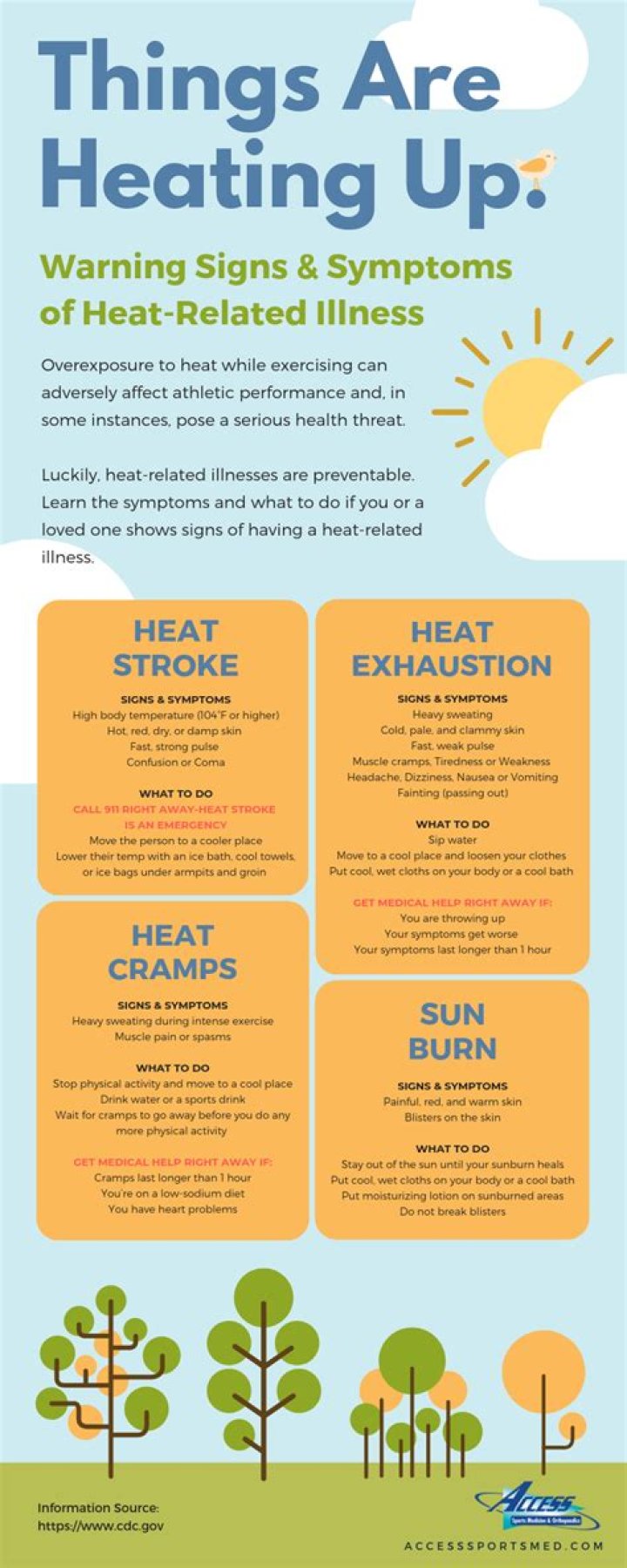 Heat emergencies have three stages: heat cramps, heat exhaustion, and heatstroke. All three stages of heat emergency are serious. If you live in hot climates or play sports in the summertime, you should know how to spot the symptoms of heat emergency.What are heat-related illnesses caused by?