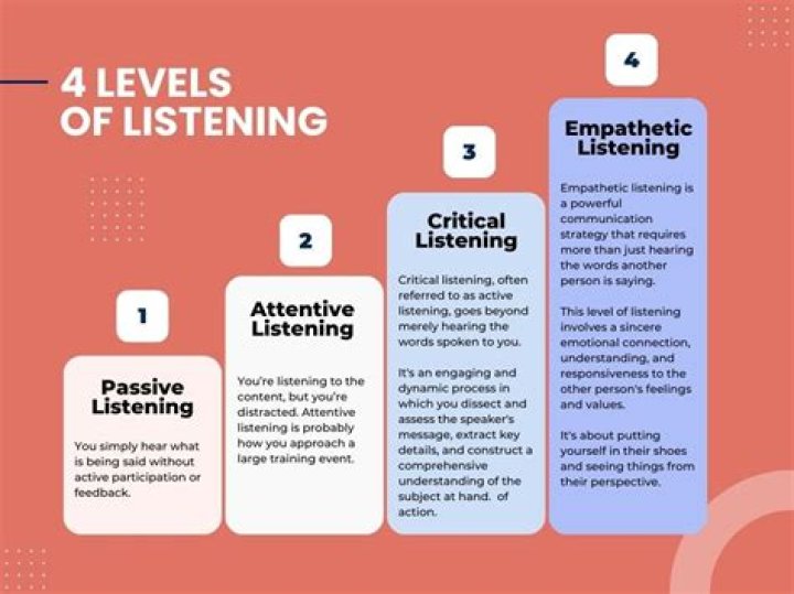 The listening process involves four stages: receiving, understanding, evaluating, and responding.What are the 4 levels of listening?