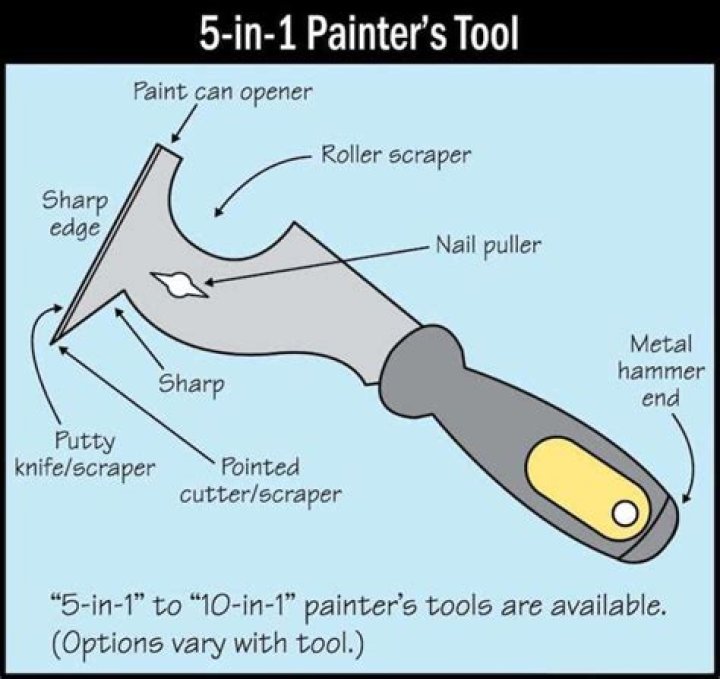 The standard 5-in-1 painter’s tool features a stainless steel blade that is detailed to function as a putty knife, a scraper, a gouger, a paint roller cleaner, and a paint can opener all packed into one multi-faceted device.