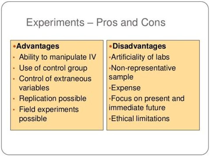 AdvantagesDisadvantagesresearcher can have control over variablescan produce artificial resultshumans perform experiments anywayresults may only apply to one situation and may be difficult to replicate