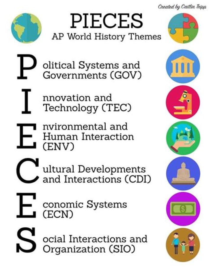 The Five themes of AP World History serve as unifying threads through which you can examine broader themes throughout each period. We use the acronym S.P.I.C.E. [Social; Political; Interactions between humans and the environment; Cultural; Economic] to help you categorize and remember the 5 areas of analysis.