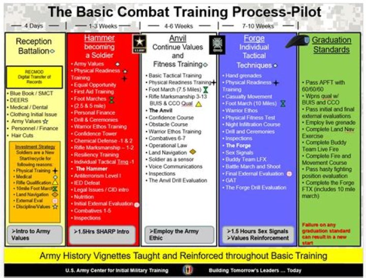 Physical readiness improves through progression in these activities. The toughening phase occurs during IMT, basic combat training (BCT), one station unit training (OSUT) (red/white/blue phases), and Basic Officer Leader Course A (BOLC A).