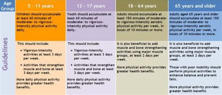 For children aged 5–12 and 13–17, the guidelines recommend: at least 60 minutes a day of moderate to vigorous intensity physical activity. no more than 2 hours a day of screen-based activity for entertainment (for example, television, seated electronic games and computer use).