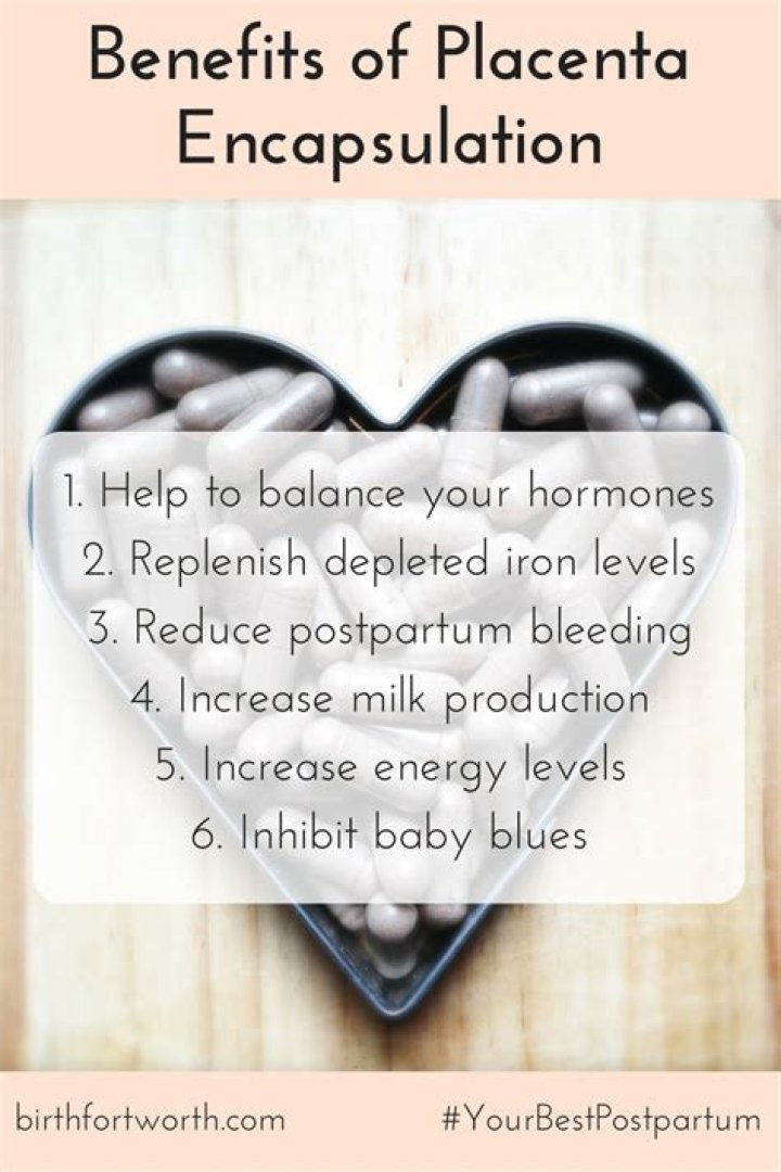 The possible benefits of placenta encapsulation include: a decrease in postpartum mood disorders, increased production of oxytocin, a decrease in stress hormones, restoration of iron levels following bleeding after birth, and increased milk supply.