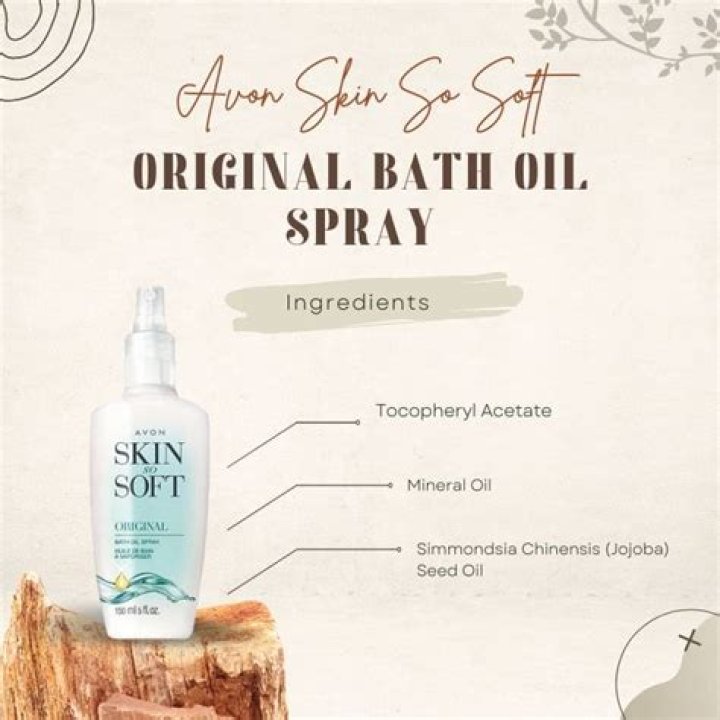 Avon Skin So Soft is supplied in a 150ml pump action spray. Ingredients: Isopropyl Palmitate, Alcohol Denat, Aqua, Parfum, BHT, Simmondsia Chinensis (Jojoba) Seed Oil, Tocopheryl Acetate, Hydroxycitronellal, Coumarin, Linalool, Citronellol, Limonene.Is Avon Skin So Soft good for your face?