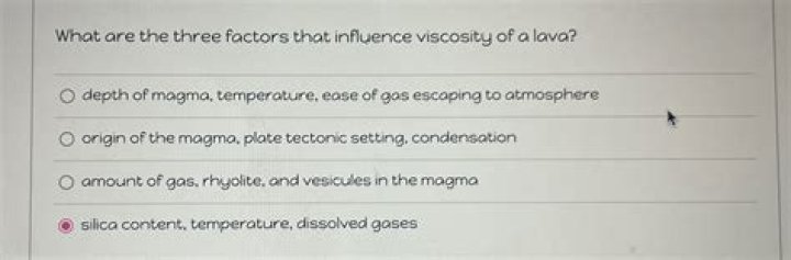 The three factors that influence the viscosity of a lava are temperature, the dissolved gases it contains, and its chemical composition.