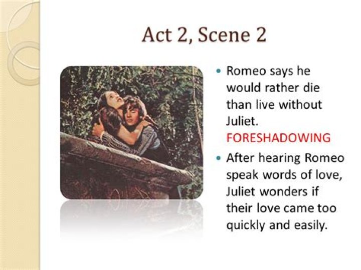 One of the most quintessential foreshadowing moments in the play occurs during the balcony scene where Romeo refuses to be intimidated by Juliet’s parents. He states that he would prefer an unanticipated death to a life bereft of Juliet’s companionship.