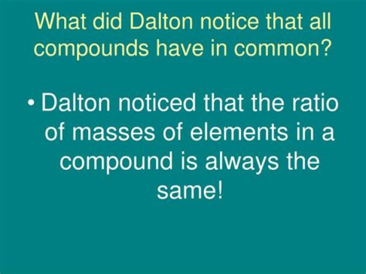 Dalton’s Experiments He researched the properties of compounds, which are substances that consist of more than one element. He showed that a given compound is always comprised of the same elements in the same whole-number ratio and that different compounds consist of different elements or ratios.What did Dalton notice about the ratio of the masses of the elements in a compound?