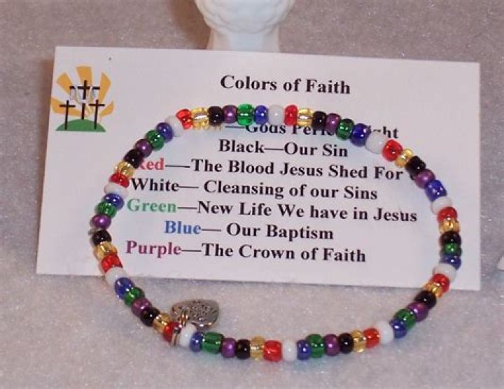 Red to represent blood. Blue to represent baptism. White to represent cleansing. Green bead to represent growth.